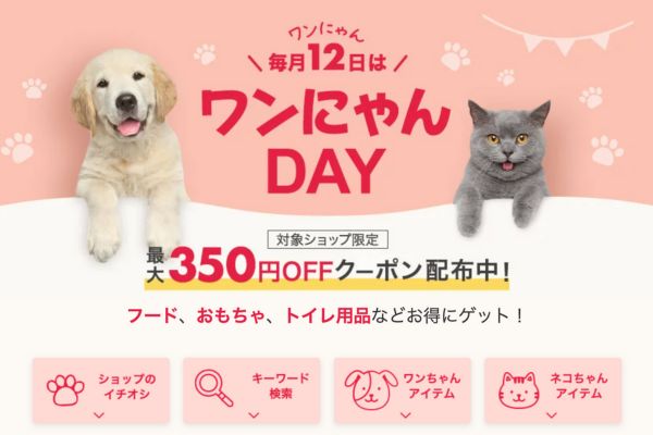 楽天では毎月12日にペット用品のクーポンを配布しています。