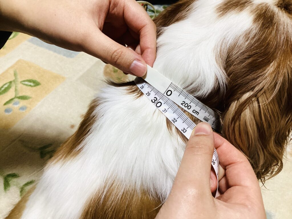 参考までに我が家のサリー(成犬キャバリア)の胴周り・首周りを紹介すると…